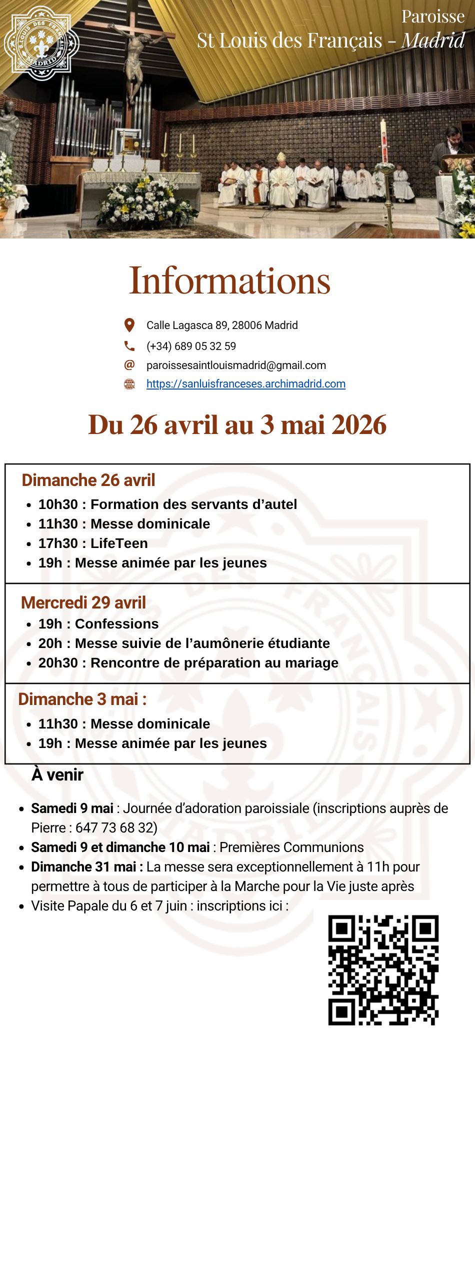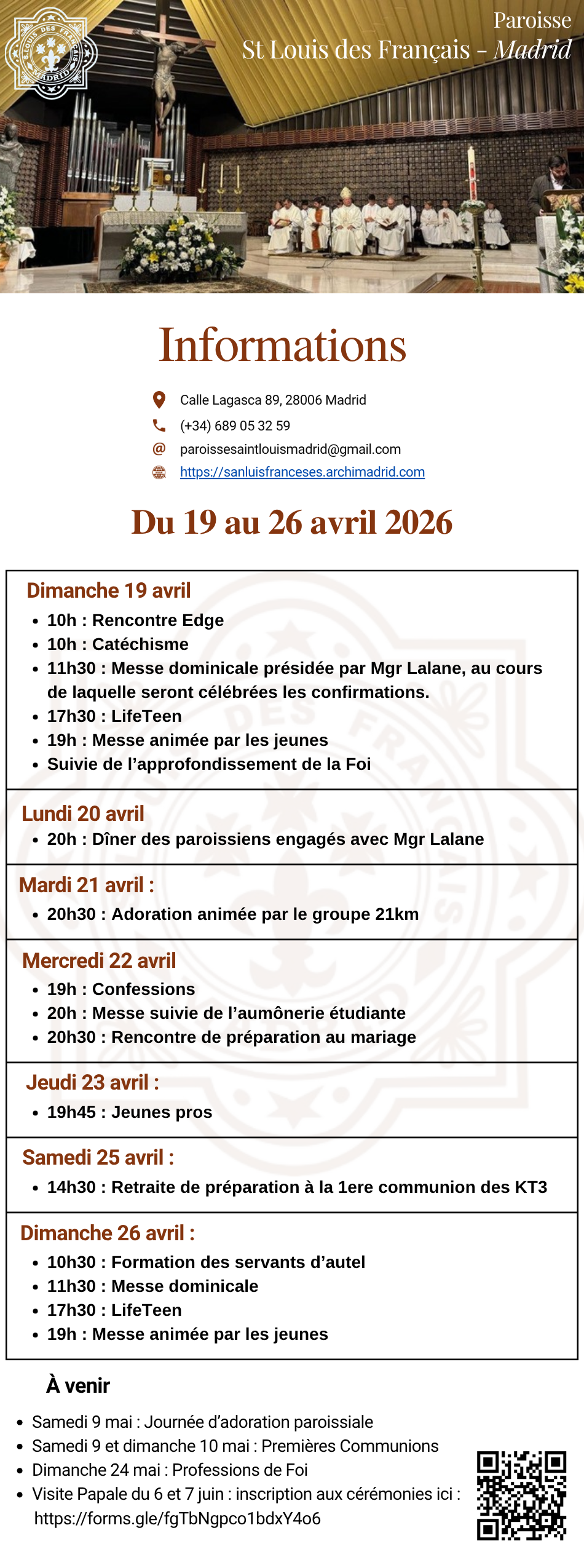 Messes en français le dimanche à 11h30 et 19h ; Le mercredi à 20h. Confessions en français ou espagnol le mercredi à 19h . Calle Lagasca, 89. paroissesaintlouismadrid@gmail.com